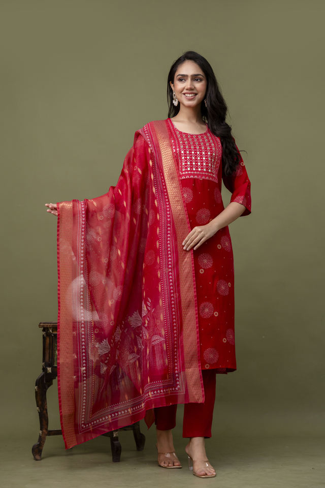 Premium Quality Woman's Vatican fabric Kurti Set Three-Piece Chanderi Zari Digital Printed Dupatta Hand Work
