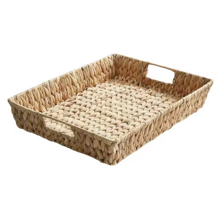 Premium Rectangular Wicker Tray, Hand-woven Water Hyacinth Serving Tray with Handles for Coffee Table, Woven Baskets for Storage