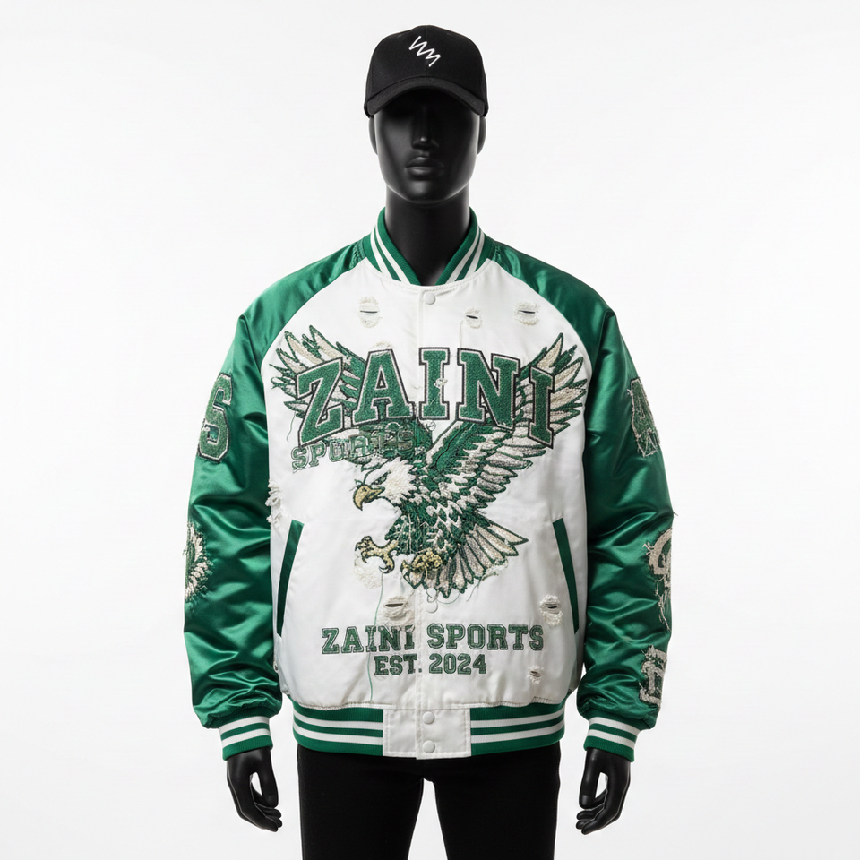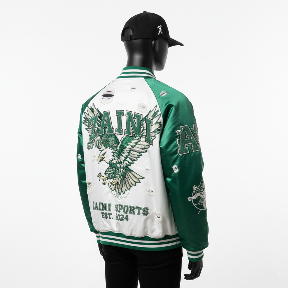 Premium Satin Jacket 180 GSM Green White Raglan Panel Design With Custom Embroidery Logo And Chenille Satin Jacket For Men