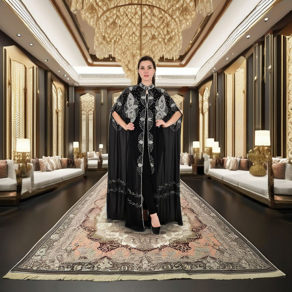 Premium Sequin Embellished Abaya Handmade Embroidered Kaftan Dress for Women Long Sleeve Front Open Plus Size for Night Parties