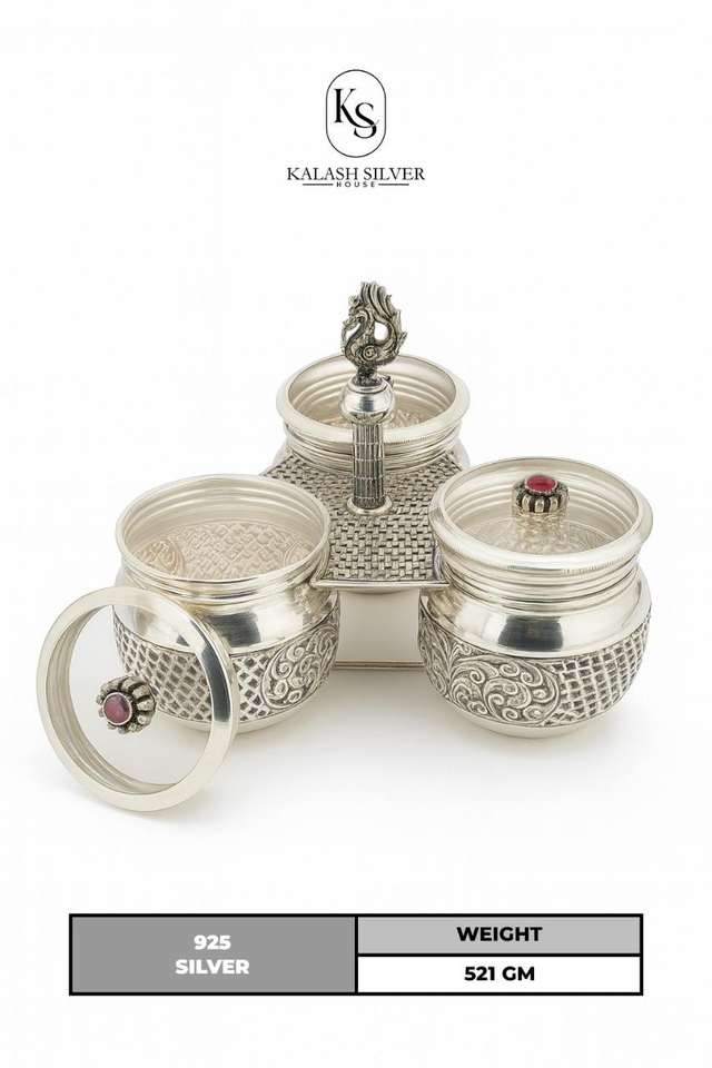 Premium Silver Dry Fruit Container Set with Decorative Stand Handcrafted Designer Storage Jars for Home Pooja and Gifting