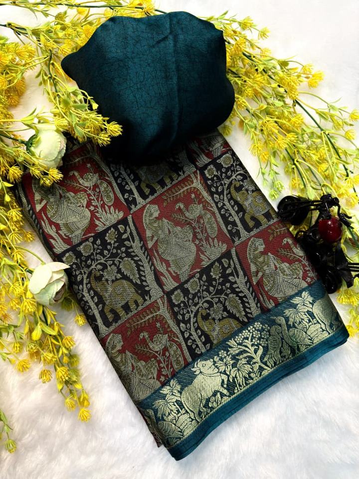 Premium Soft Womens Dola Silk Sarees with Contrast Zari Weaving Hamsa Border and Rich Kalamkari Pallu Made in India In-Stock