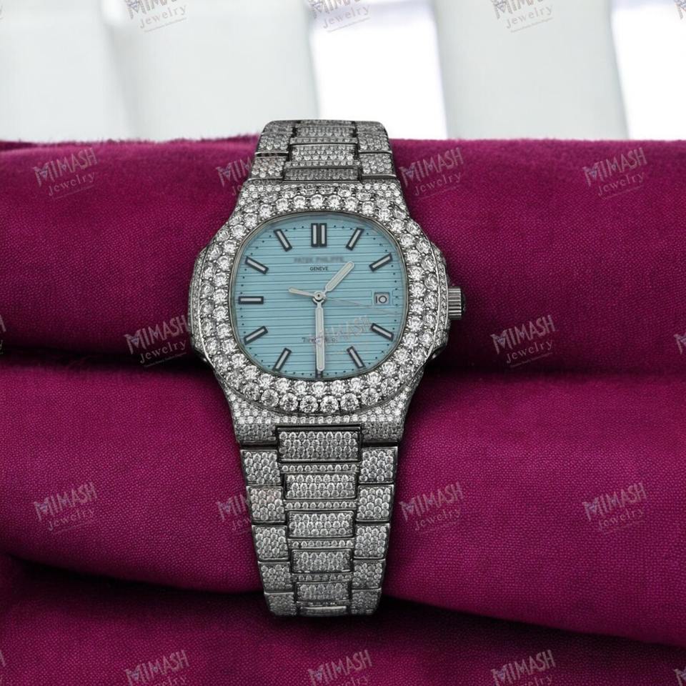 Premium Stunning Light Blue Tone Fancy Dial Full Iced Out Round Moissanite Watch for Man Available at Affordable Price