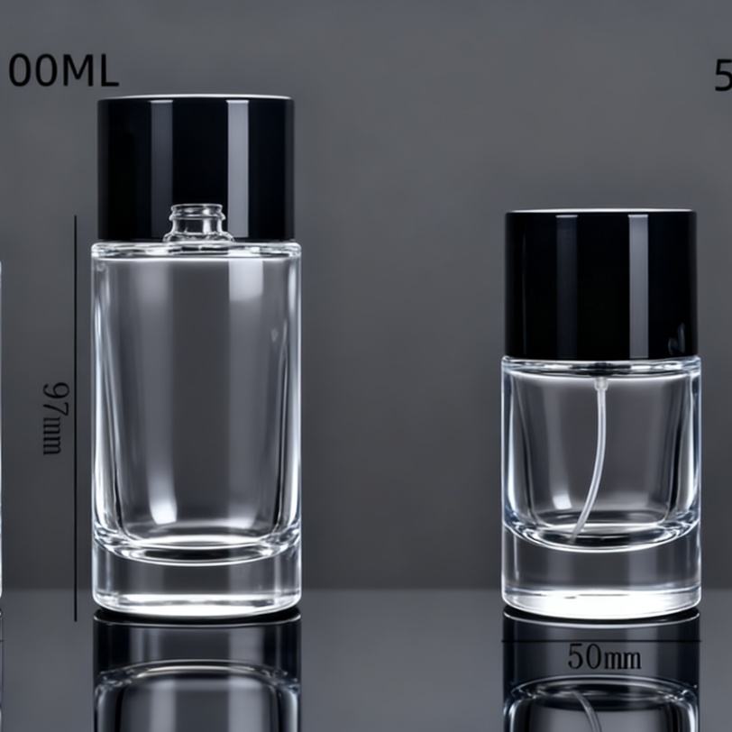 Premium Transparent Cylindrical Glass Perfume Bottle 30ml 50ml Sleek Glossy Black Cap