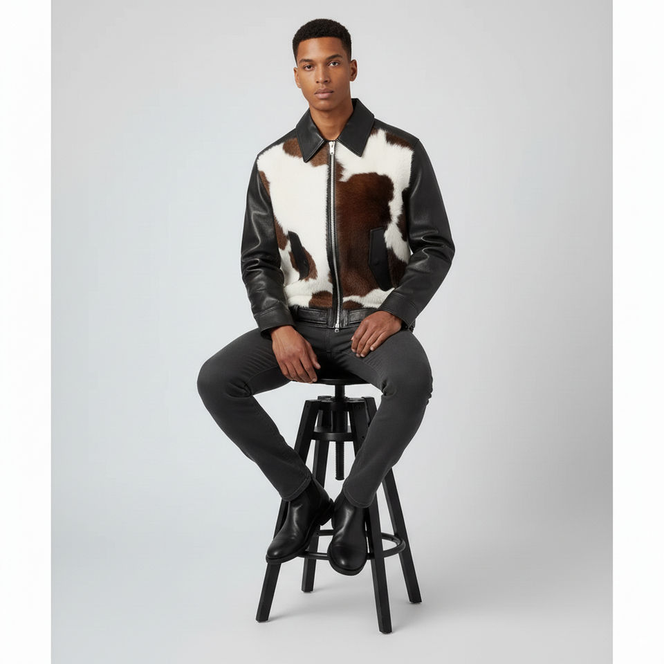 Premium Trendy Cowhide Shearling Fur Leather Jacket for Men Hair On Hide Racing Biker Bomber Winter Wear