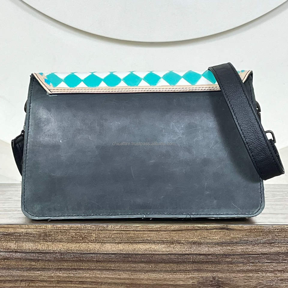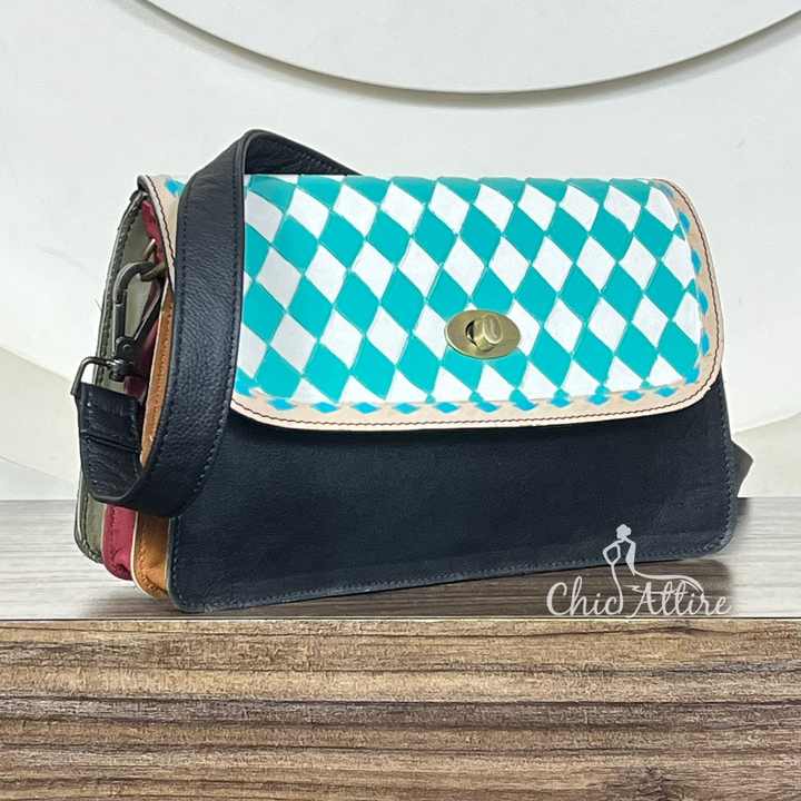 Premium Turquoise Checkered Leather Women Crossbody Bag New Fashion Western Style Genuine Leather Travel Friendly Shoulder Purse