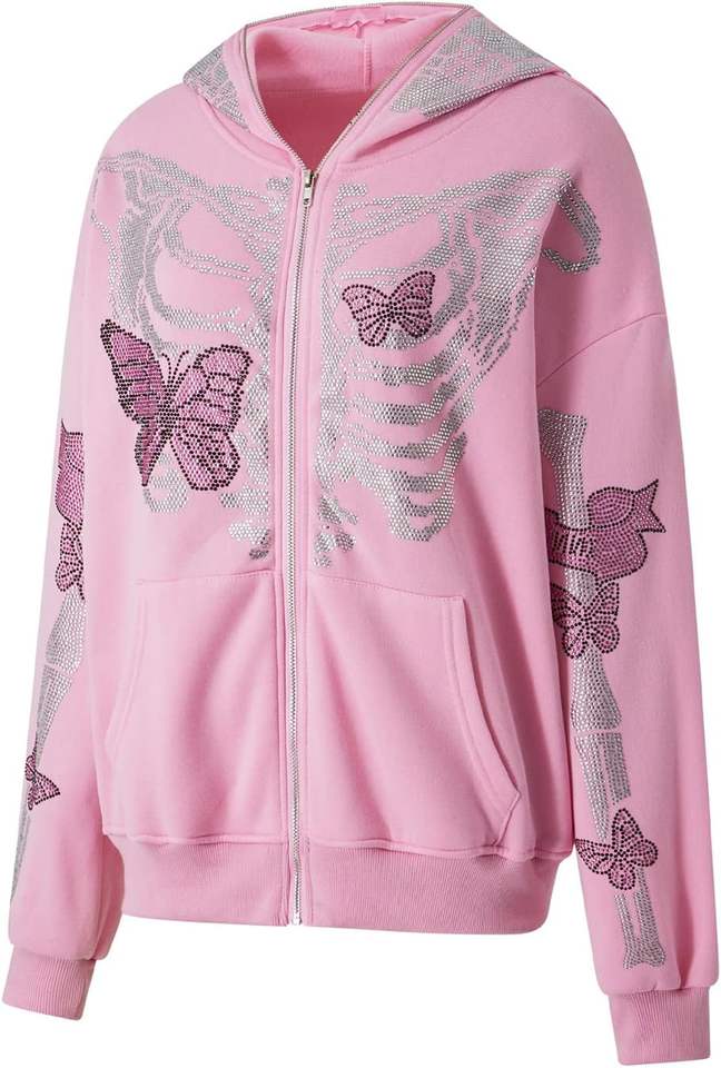 Premium Unisex Rhinestone Y2K Winter Full Zip-Up Hoodie Oversized Skull Skeleton Sweatshirt Zip Over Face Gothic Jacket ODM
