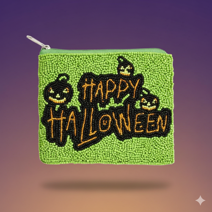 Premium Vintage Halloween Beaded Coin Purse Spooky Ghost Pumpkin Bead Mini Pouches Bohemian Festive Artisanal Zipper Closure