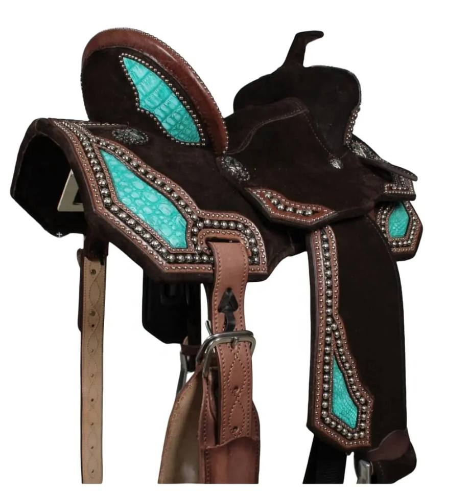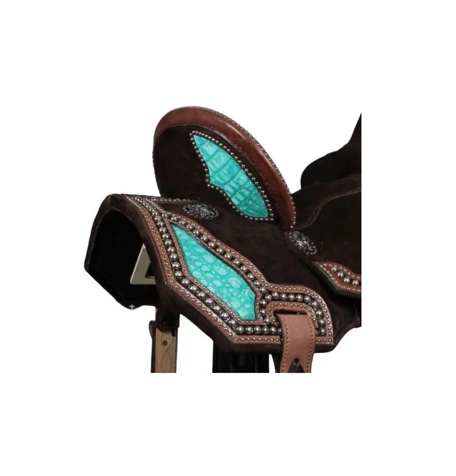 Premium Western Rough out Treeless Saddle With SS studs & Conchos Turquoise Crocodile Highlights Padded seat Saddle Hot Selling