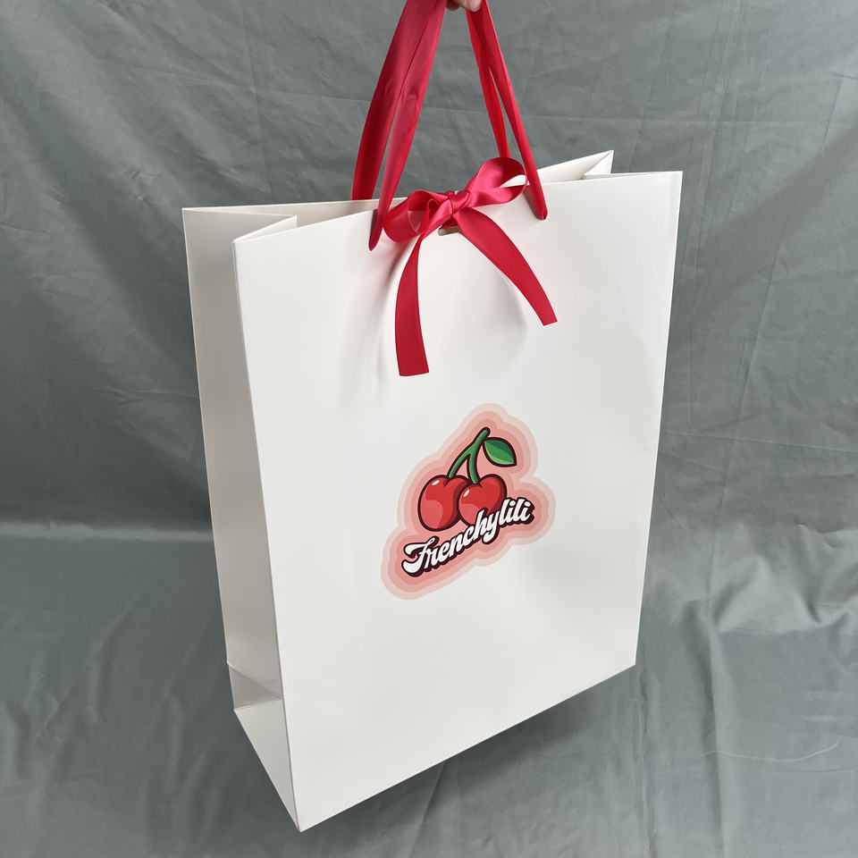 Premium White Paper Tote Bags with Red Ribbon Handles - Custom Branded Printed Packaging for Retail & Gifting