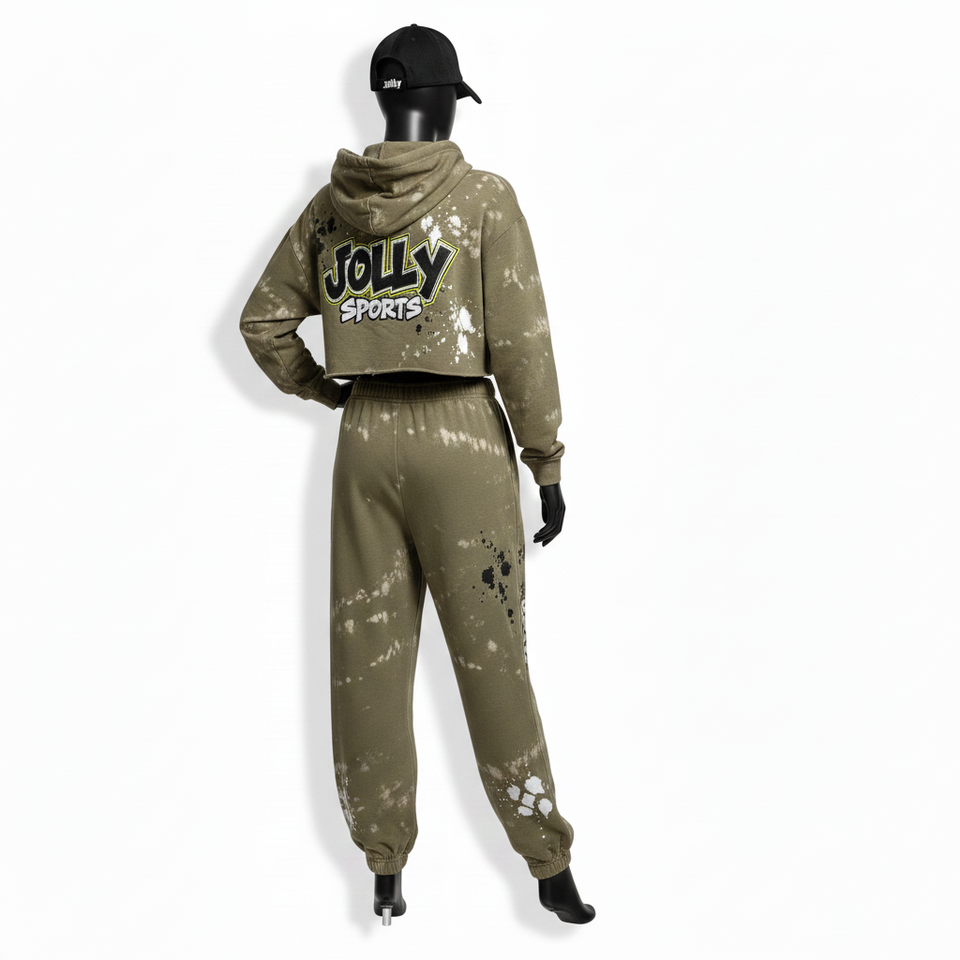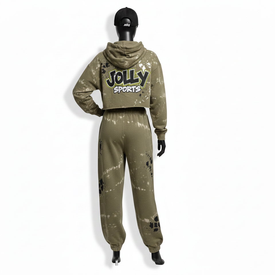 Premium Women Tracksuit 320GSM Heavy Fleece Olive Bleach Wash Fabric with Custom Screen Print Logo Set Tracksuits Plus size