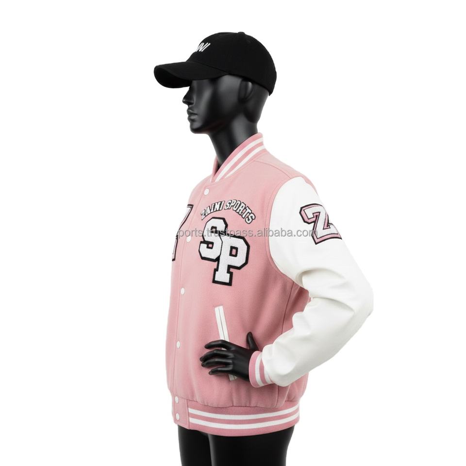 Premium Women Varsity Jacket 330 GSM Wool Pink Body White Sleeves Letter Patch Embroidery Custom Logo Women Varsity Jacket