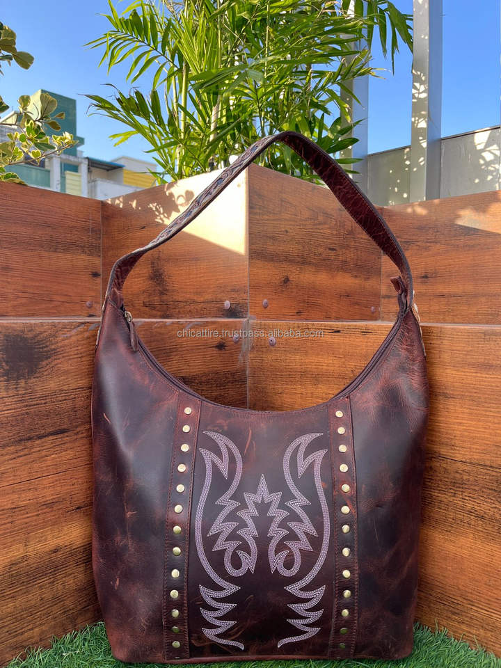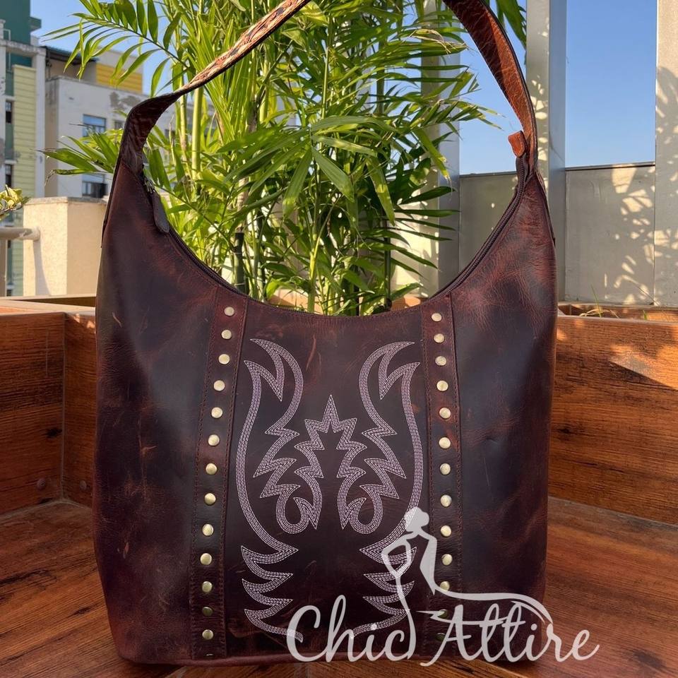 Premium Women's Genuine Leather Tote Bag Western Hand Tooled Black Suede Leather Boot Stitch Design Concealed Carry Daily Custom