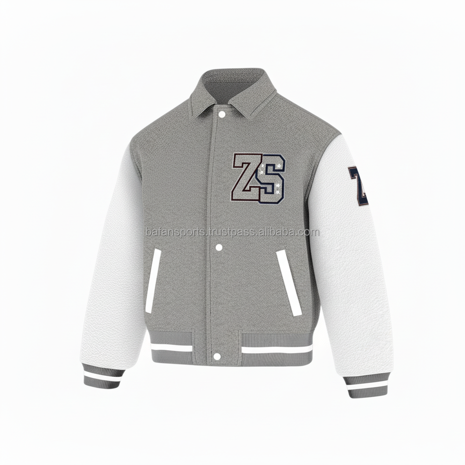 Premium Wool Fleece Varsity Jacket 450 GSM Soft Texture White Leather Sleeves Gray Body Custom Chenille Varsity Jacket for man