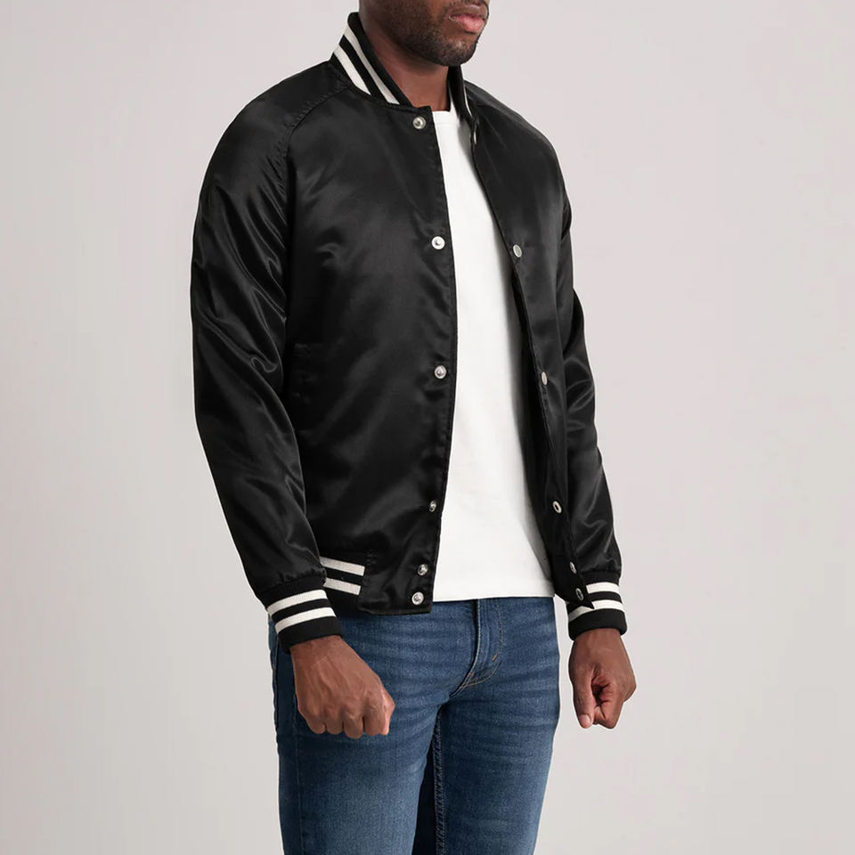 Premium Xander Black Winter Varsity Jacket Satin Outer Quilted Polyester Lining Stand Collar Button Closure Rib Knit Details