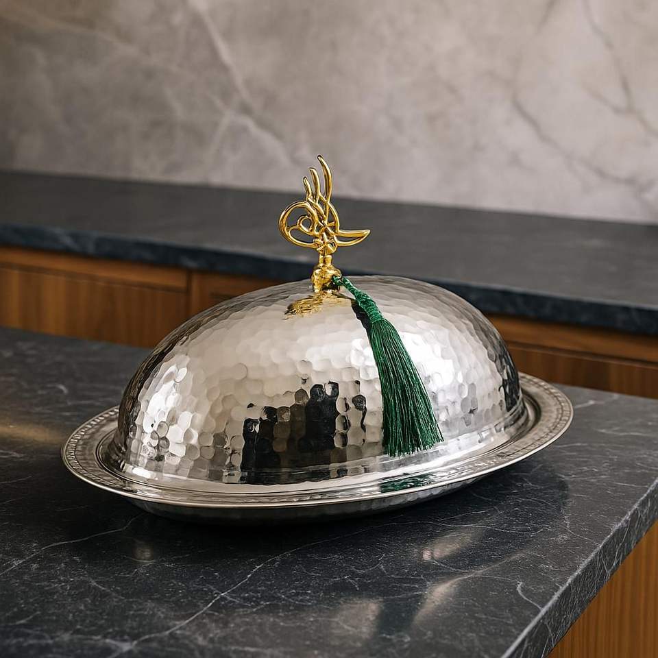 Premium metal serving dish with lid designed luxury food presentation dates dry fruits sweets chocolates snacks special dishes