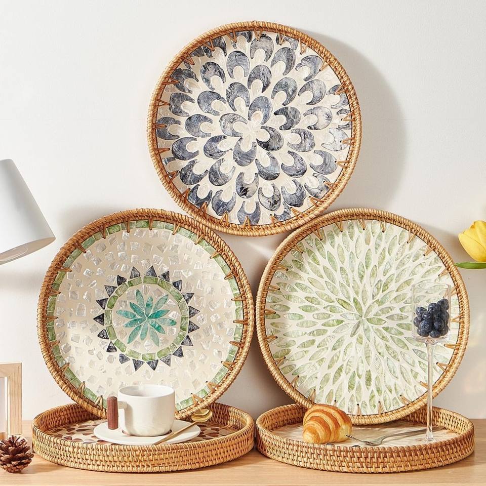 Premium quality rattan mother of pearl candle tray nacre inlay candles holder MOP organizer trays