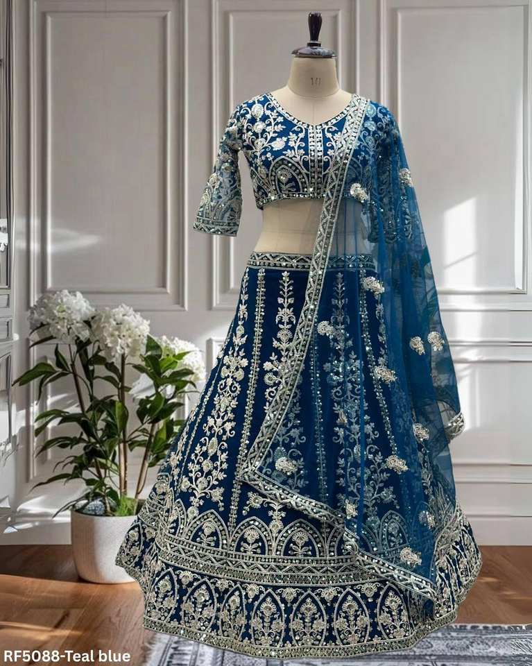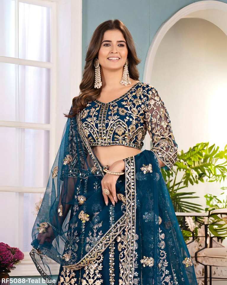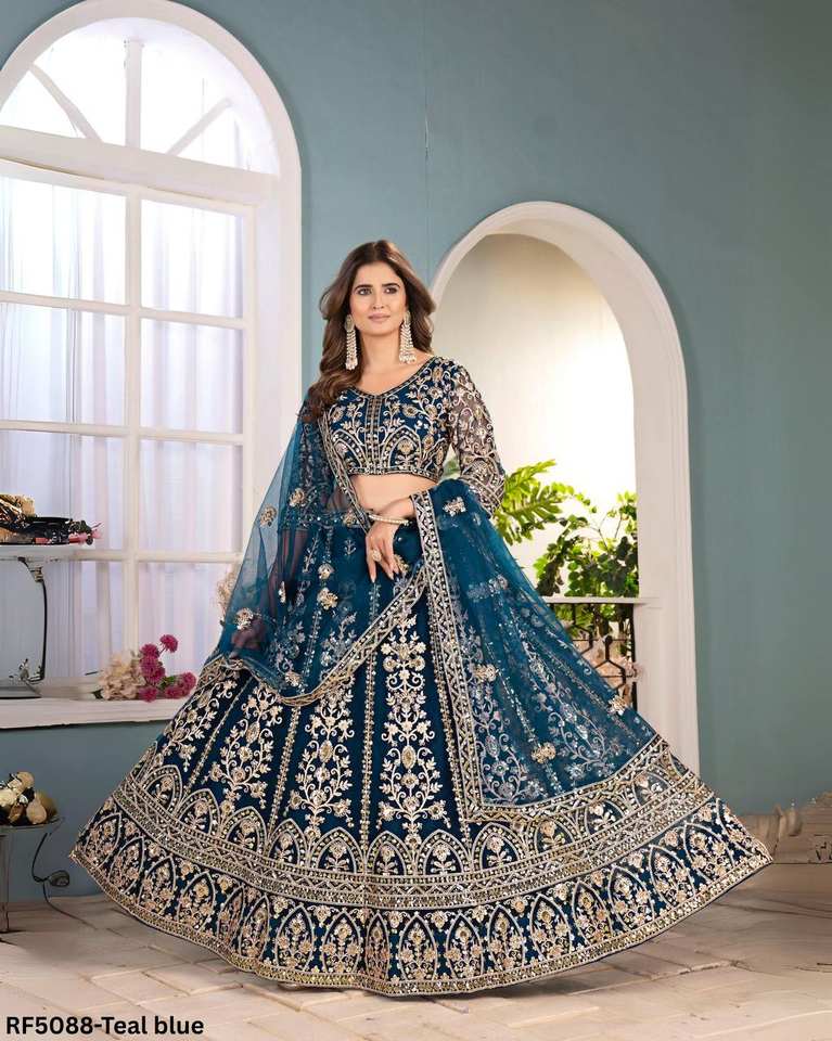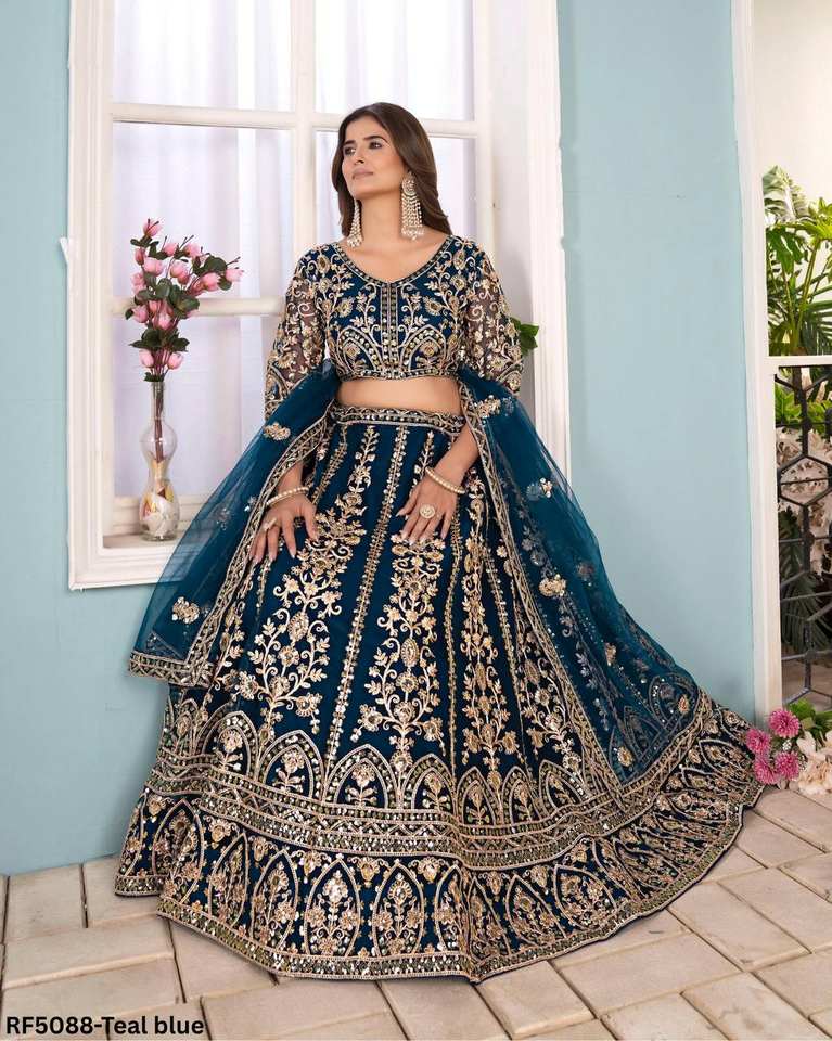 Premium teal blue designer lehenga choli set rf5088 with heavy embroidery sequins work net fabric dupatta wedding and festive