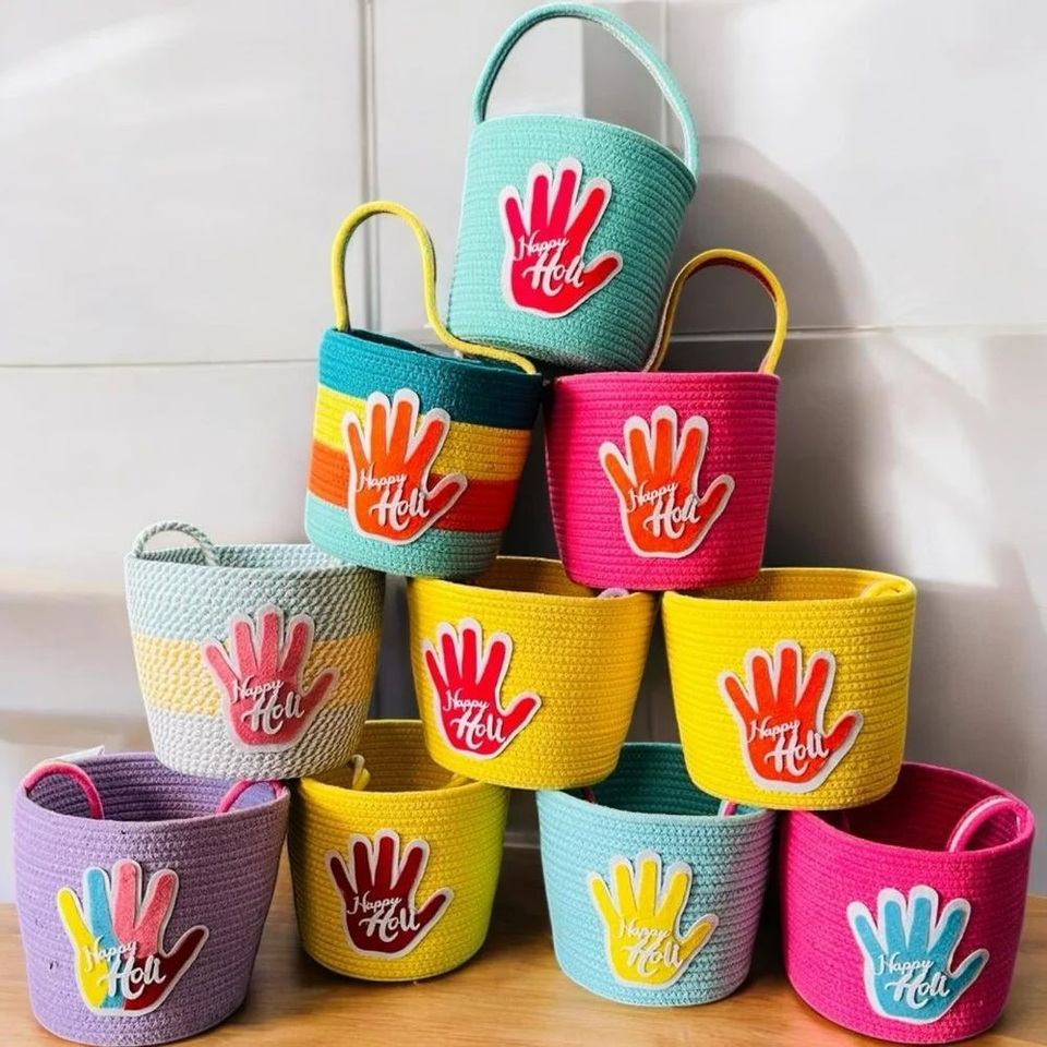 Premum Aticue Cotton Rope Multicolor Basket 7x8 Inch Pack of 2 Round Gift Basket for Kids Holi Home Decor Storage with Handle