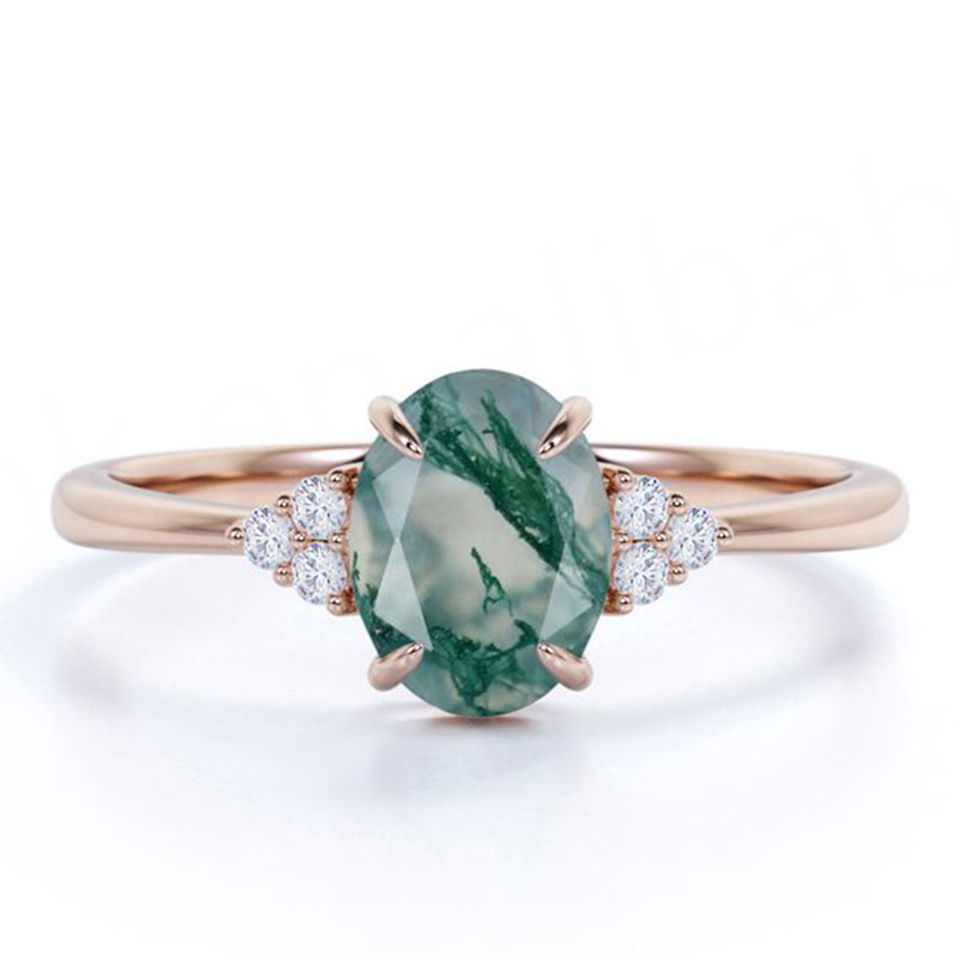 Present Future Floral Bezel Cut Natural Transparent Moss Green Agate Moissanite Engagement Ring Vine Unique Floral Design Luxury
