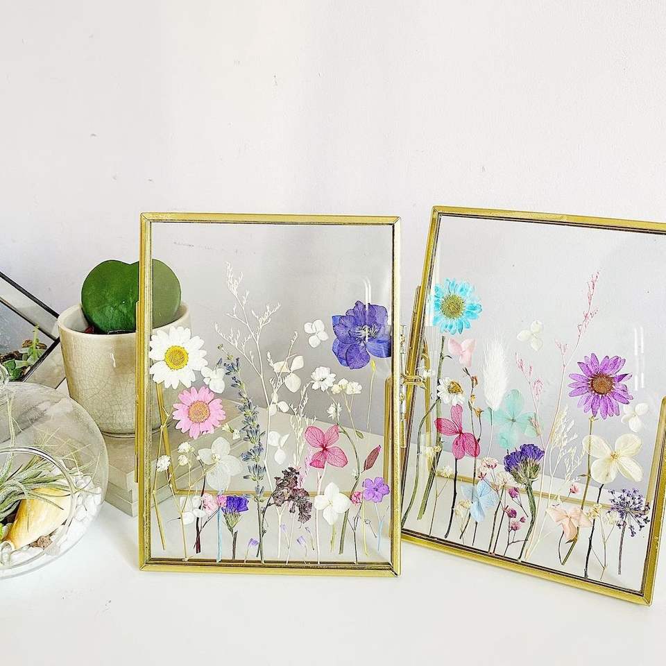 Pressed Flowers Brass & Glass Golden Hanging Picture Frames With Chain Floating Wall Decor Artwork Display Frames