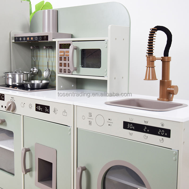 Pretend 3-in-1 Kitchen + Fridge + Laundry Play Set Modern Sage Green Wooden Kids Play Set with Oven, Microwave, Sink and Faucet