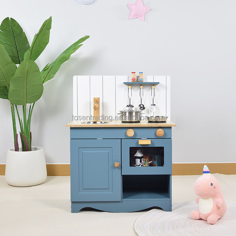 Pretend Play Toy Toddler Blue Wooden Play Kitchen Set for Kids with Cooking Accessories, Oven, Microwave, Sink & Faucet