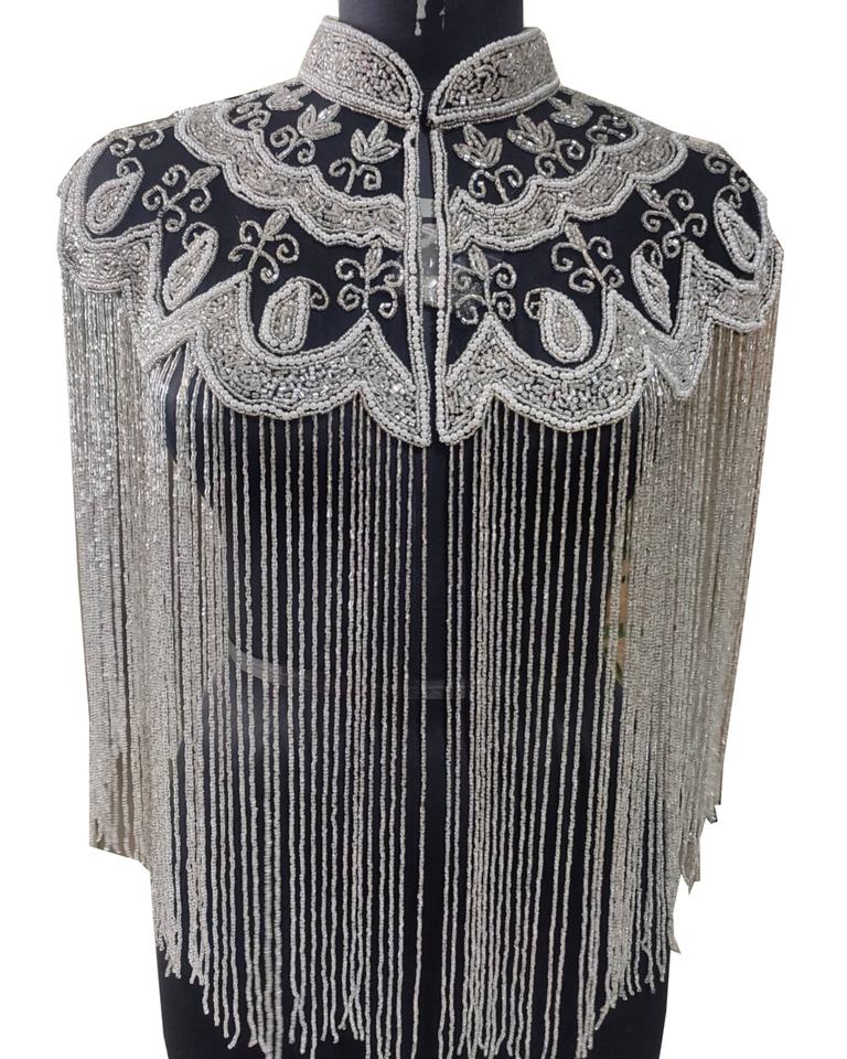 Description:dense Handembroidery and shiny handbeaded fringe cape