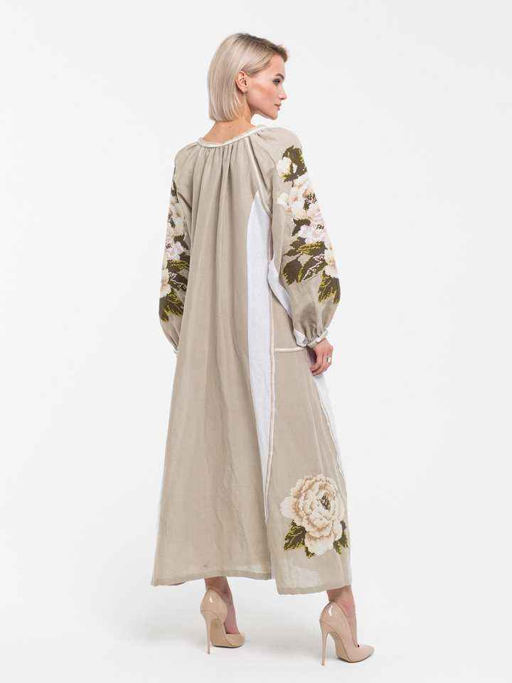 Pretty Beige & White Stars Embroider Linen Ukrainian Style Women Boho Dress Bohemian Fashion Beach Robe Wedding Guest Outfit