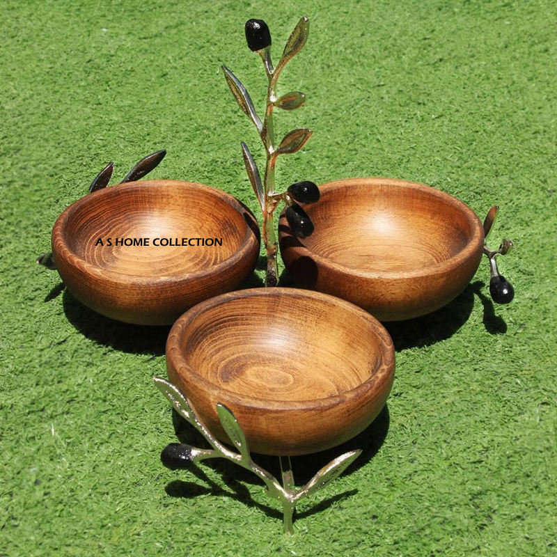 Prime Quality Wooden Metal Bowl Kitchen Organizer Tableware Food Serving Bowl Hotel Supplies 3 in 1 Bowl