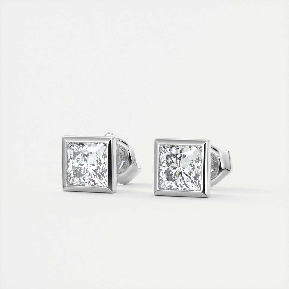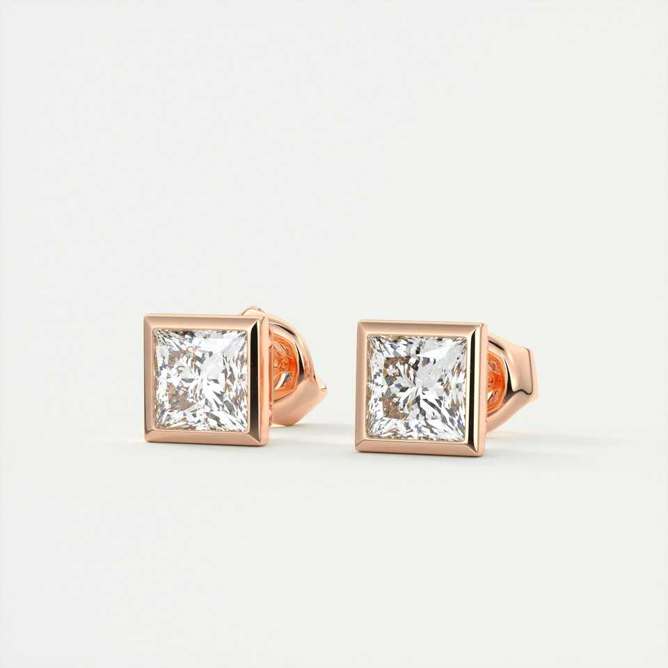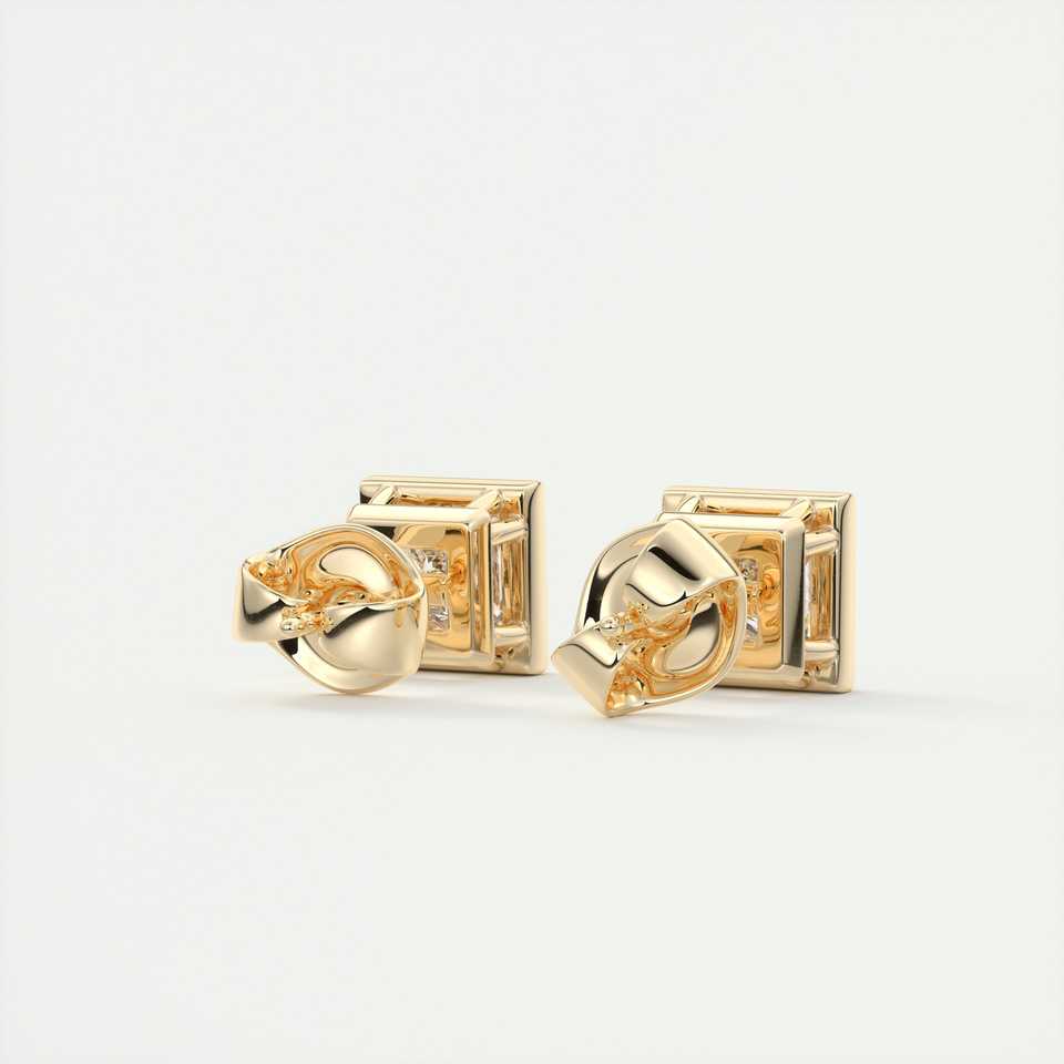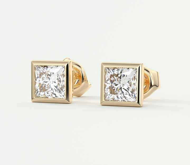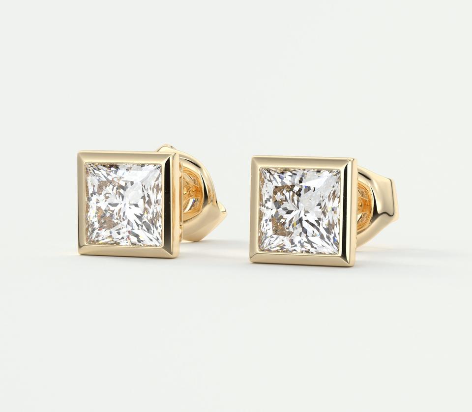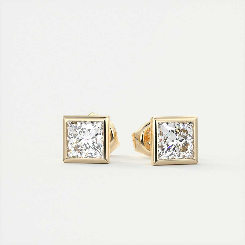 Princess Cut Lab Grown Diamond Earring Yellow Gold Square Princess Cut Stud Earring 1 + 1 Ct Bezel Set CVD Diamond Stud Earring