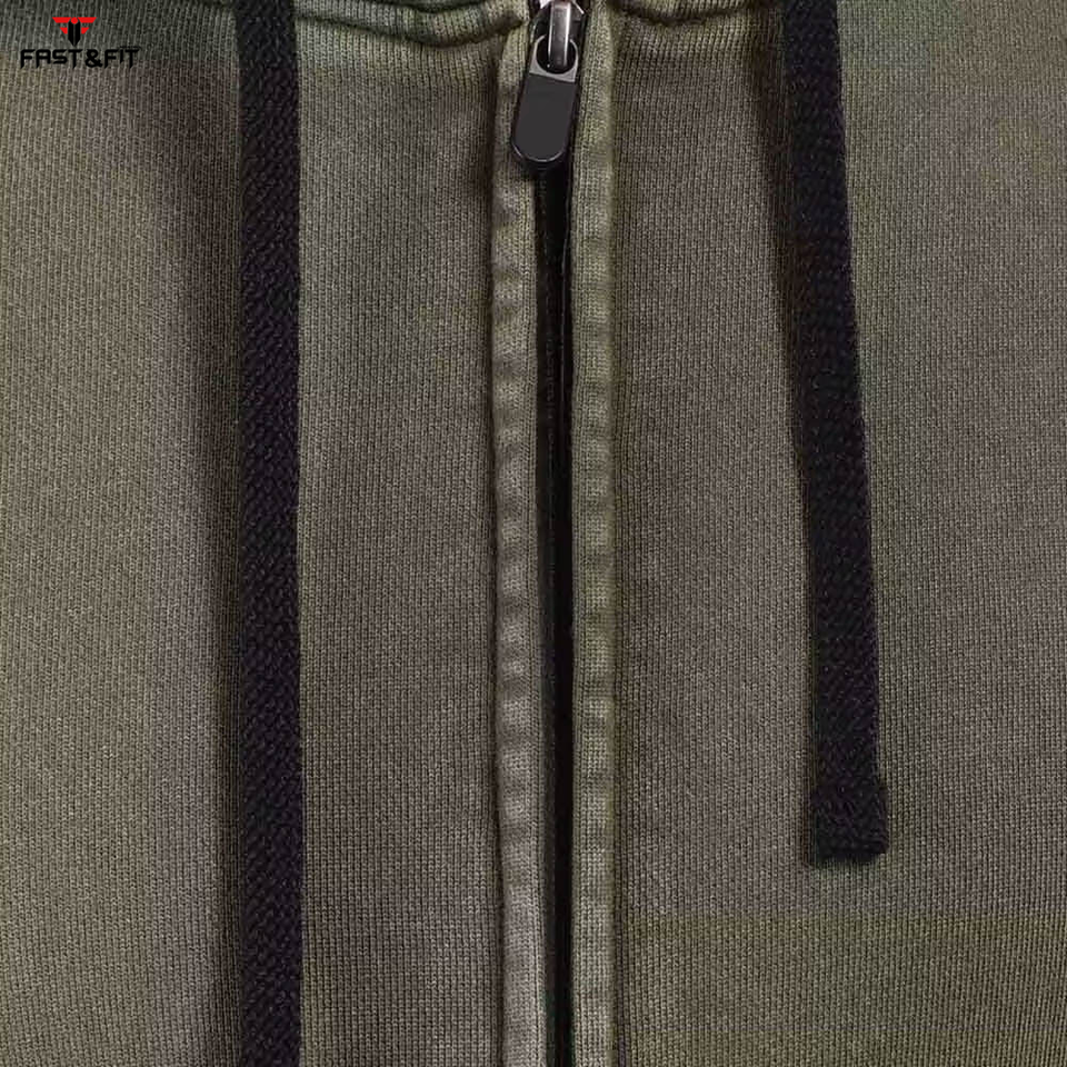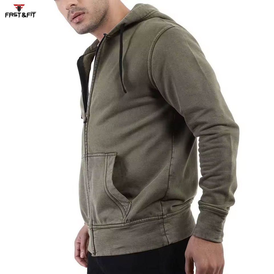 Printed Acid Washed 3D Embroidery Men's Zip-Up Hooded Winter Pullover Hoodie with Long Sleeves