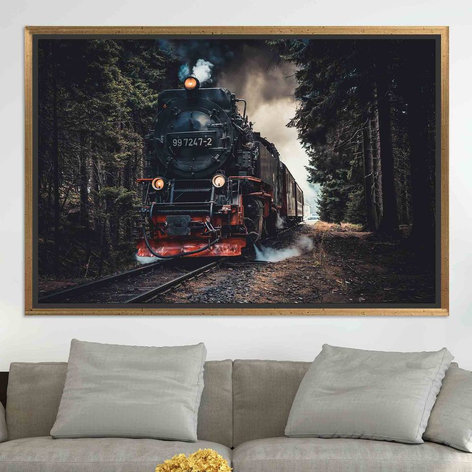 Printed Canvas: 3D Train View, Farmhouse Decor Artwork,GOLD FRAMED CANVAS