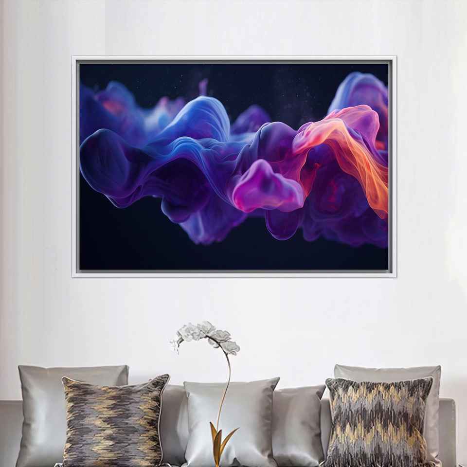 Printed Canvas: Abstract Fluid Color Art, Modern Purple Blue Smoke Decor,1P:White Framed