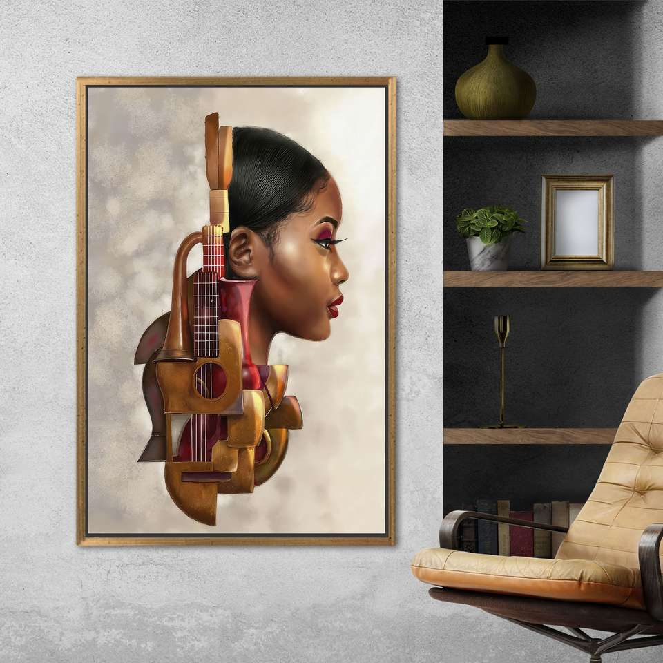 Printed Canvas: Abstract Musician Woman Art for Office Decor,Gold Framed