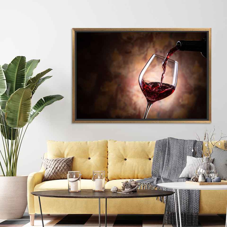 Printed Canvas Art: Modern Red Wine Glass Kitchen Decor,GOLD FRAMED CANVAS