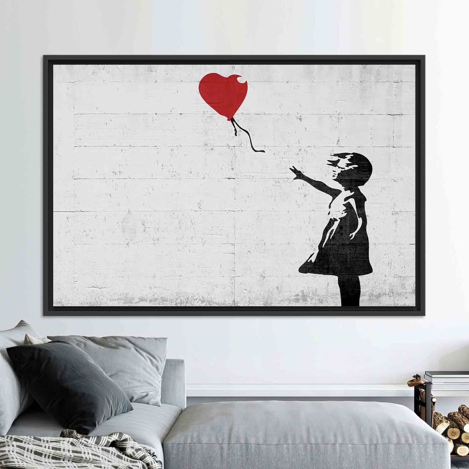 Printed Canvas Artwork: Banksy Girl with Heart Balloon,BLACK FRAMED CANVAS