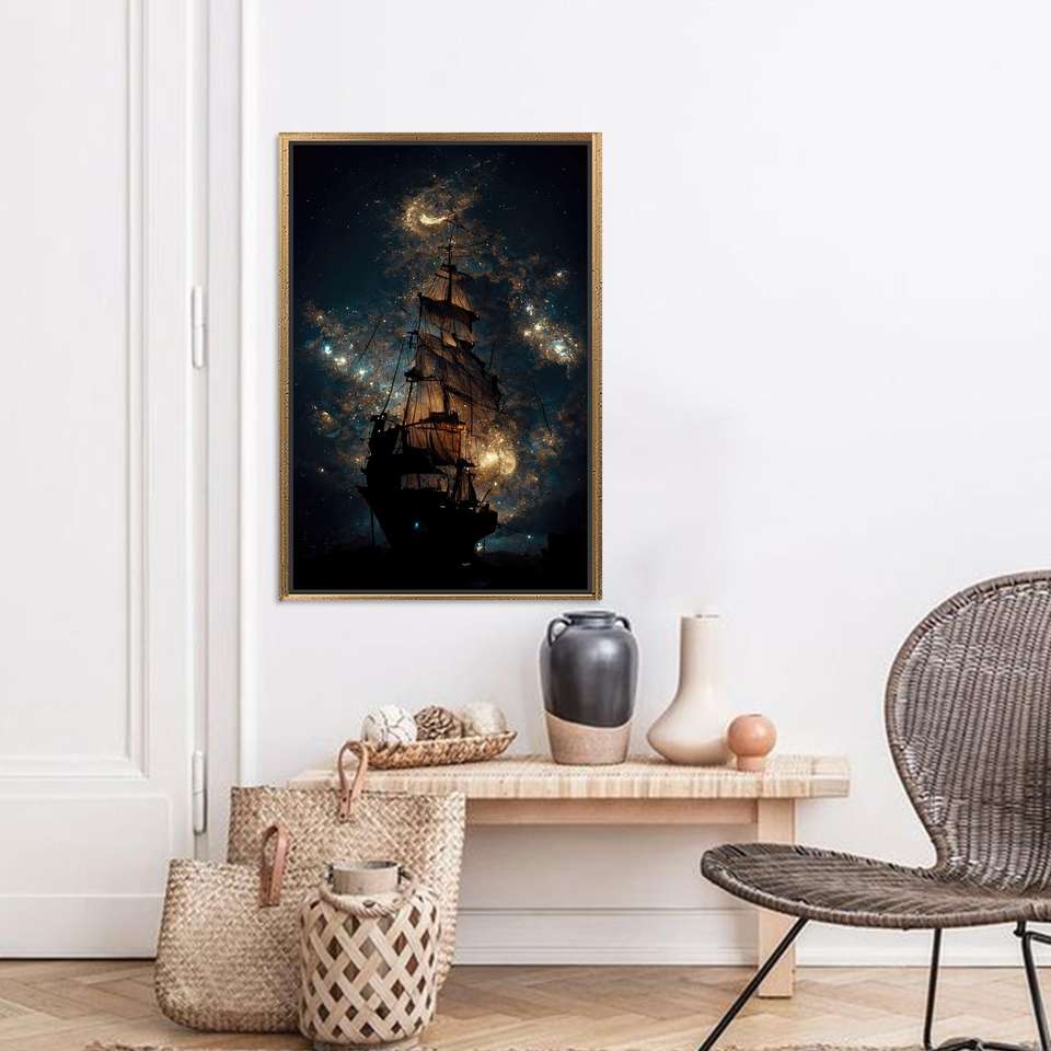 Printed Canvas Artwork: Galaxy Sailing Ship Modern Wall Decor,GOLD FRAMED CANVAS
