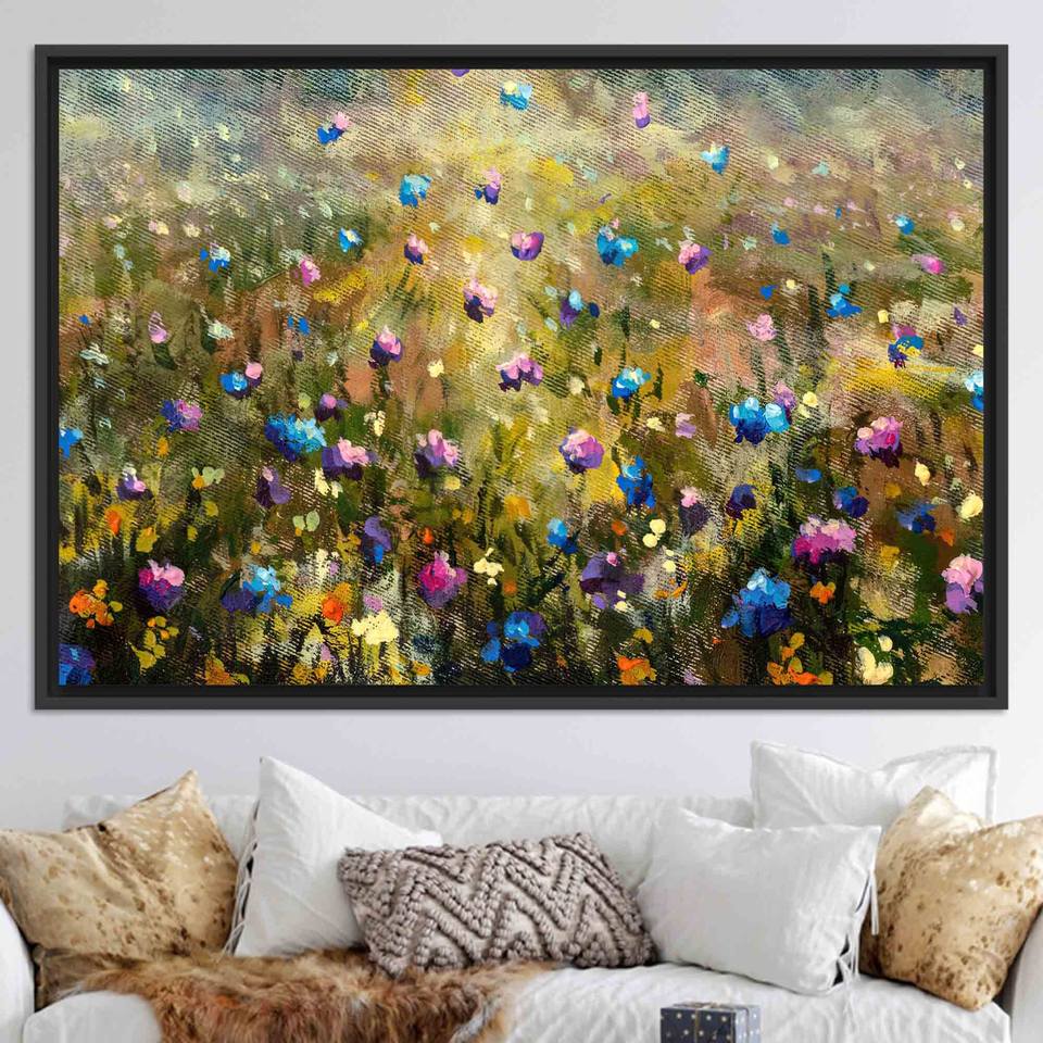 Printed Canvas Artwork: Modern Floral Wall Decor with Wildflower Field Design,BLACK FRAMED CANVAS