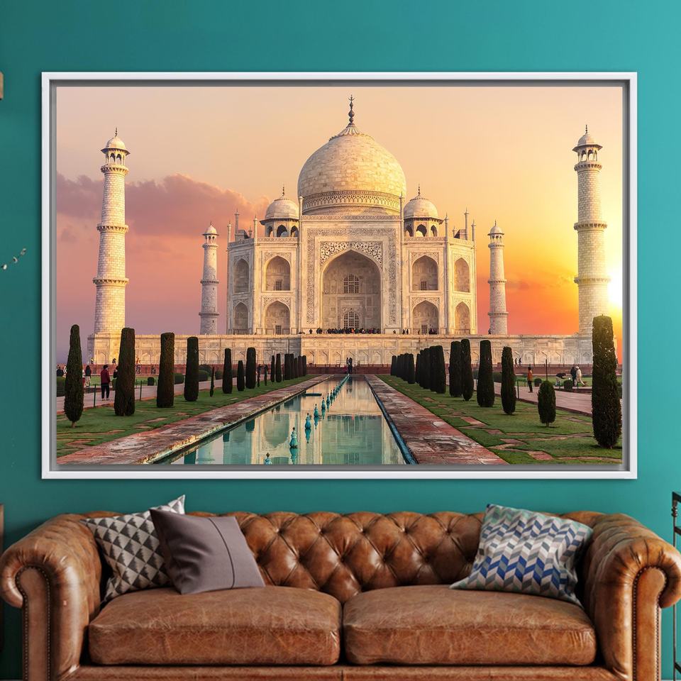 Printed Canvas Artwork: Sunset Indian Architecture & Seven Wonders,1P:White Framed