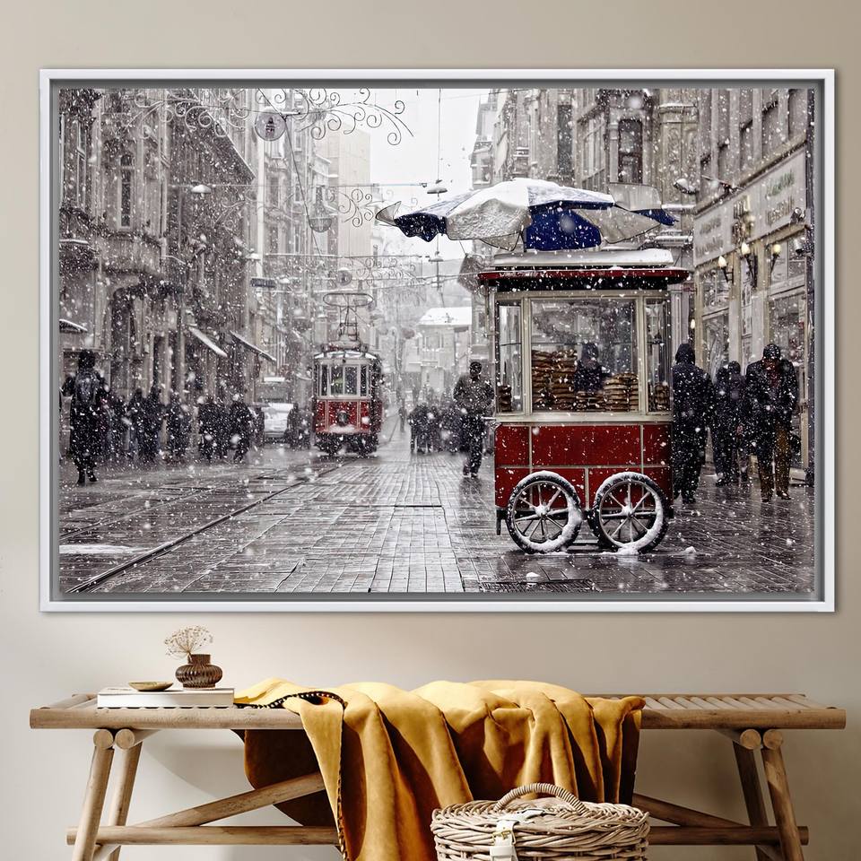 Printed Canvas Artwork: Winter in Istanbul - Red Tram View,1P:White Framed