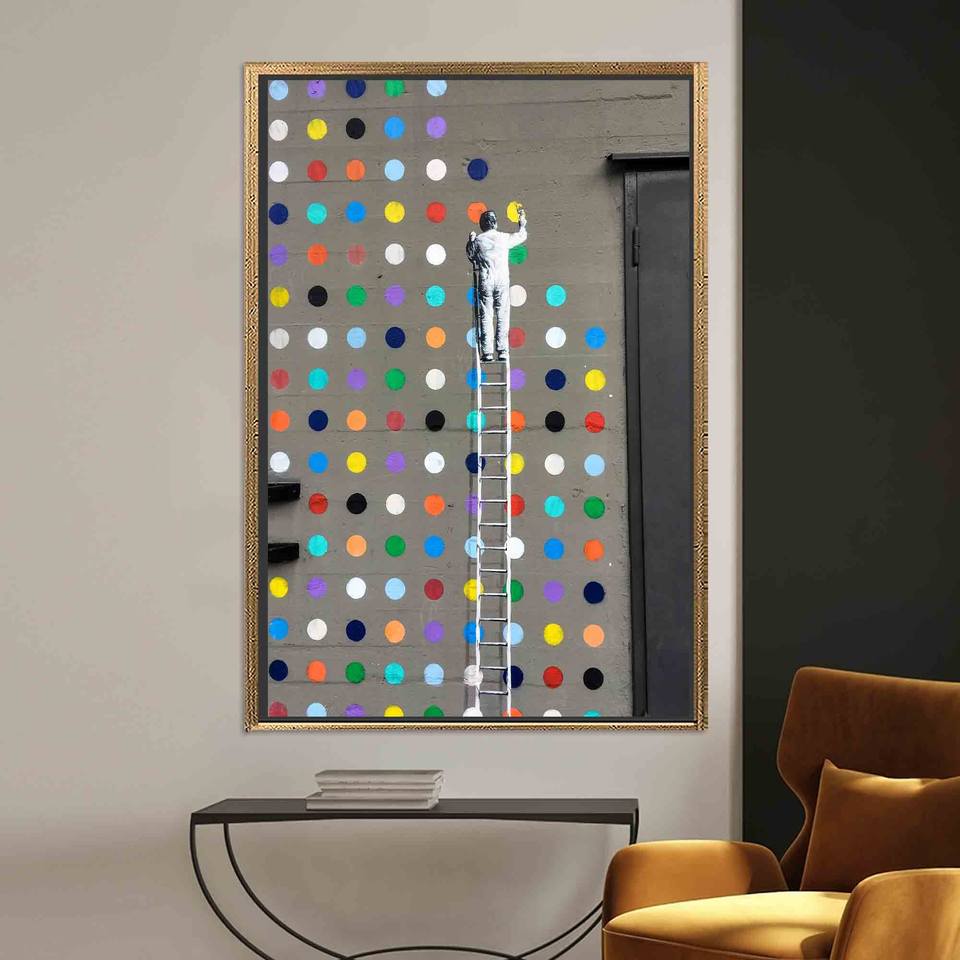 Printed Canvas: Banksy Inspired Colorful Dot Painter Wall Art,GOLD FRAMED CANVAS