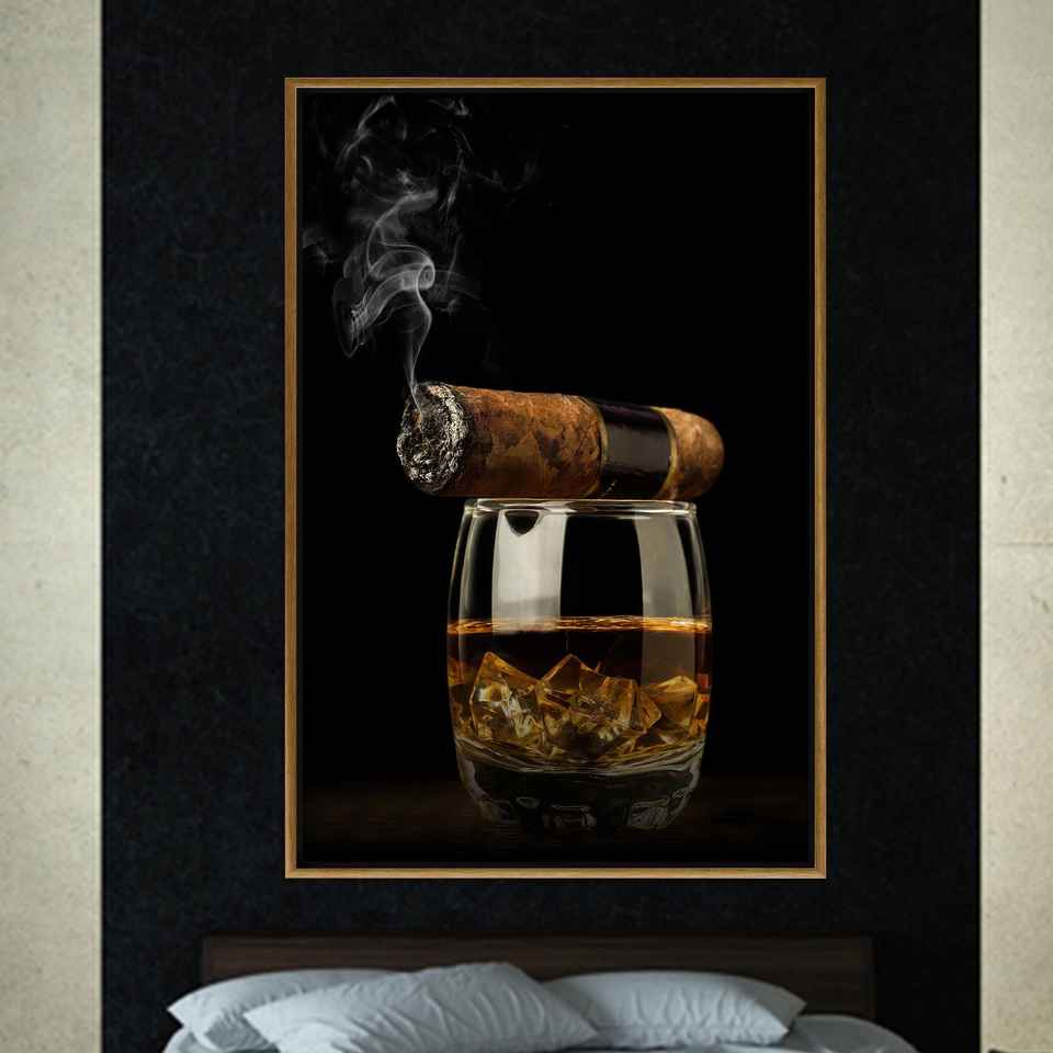 Printed Canvas: Cigar & Whiskey Glass Art for Elegant Decor,GOLD FRAMED CANVAS