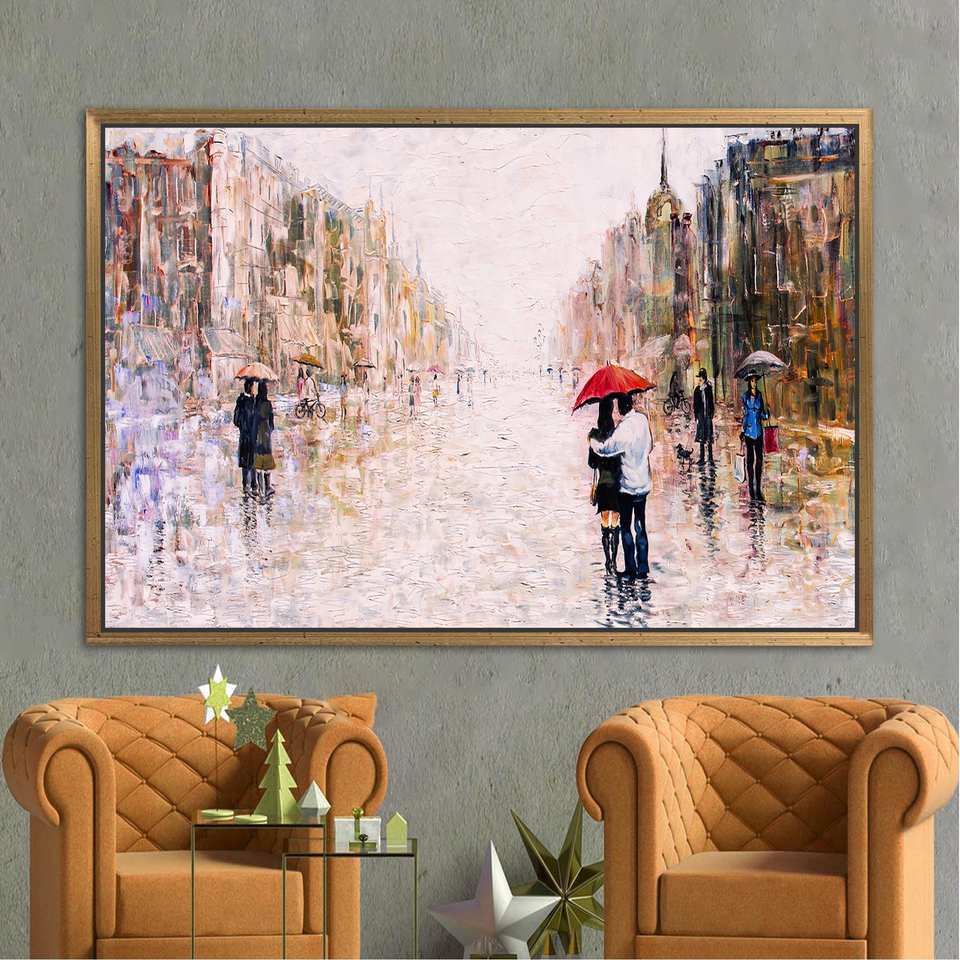 Printed Canvas: Couple with Red Umbrella in Urban Landscape,1P:Gold Framed