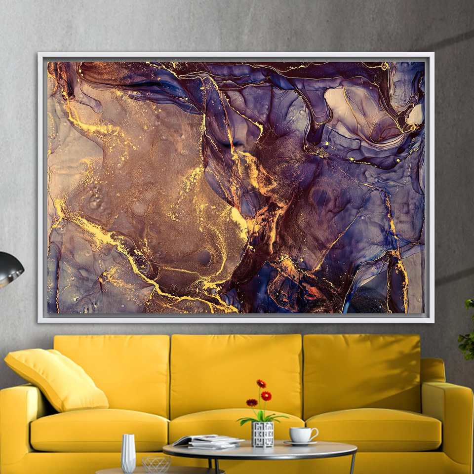 Printed Canvas: Modern Abstract Luxury Marble Artwork in Purple & Gold,1P:White Framed