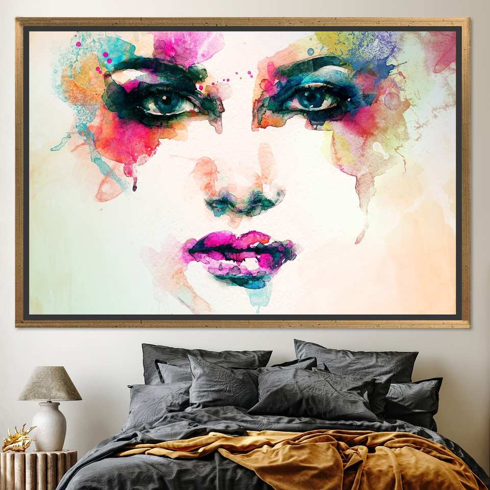 Printed Canvas: Modern Colorful Woman Face Artwork - Elegant Wall Decor,GOLD FRAMED CANVAS