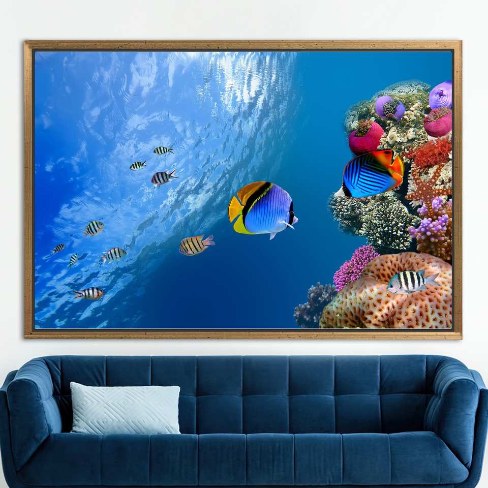 Printed Canvas: Tropical Fish Wall Decor, Ocean Landscape Artwork,1P:Gold Framed
