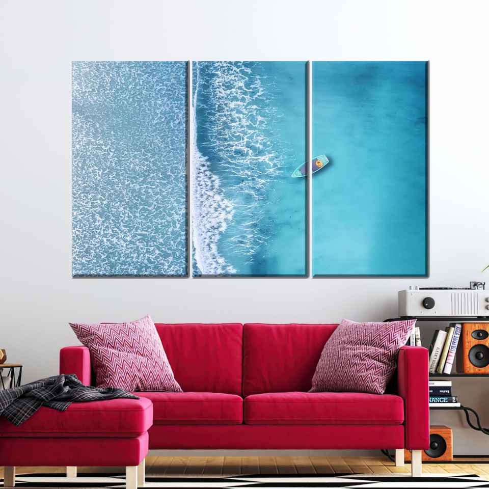 Printed Canvas: Turquoise Blue Sea Art for Coastal Summer Decor,3P: White Framed