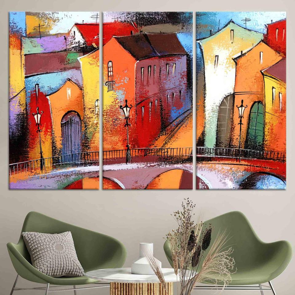 Printed Canvas: Vibrant City View, Modern Stained Glass Style Art,SET OF 3 CANVAS