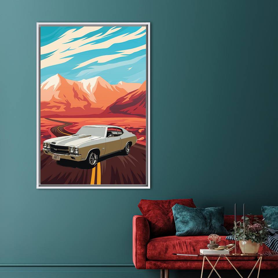 Printed Canvas: Vintage American Muscle Car Artwork, Retro Graphic Design,White Framed